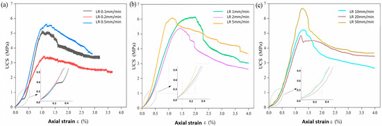 Stress–strain curves of the specimens under different LRs: (a) static (0.1~0.5 mm·min−1); (b) quasi-dynamic (1~5 mm·min−1); (c) dynamic (10~50 mm·min−1).
