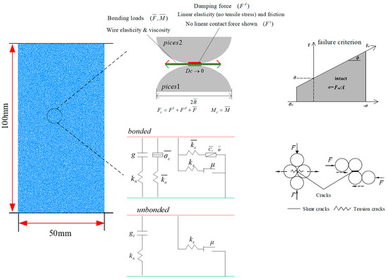 Rocks are composed of a collection of mineral particles, and the parallel bonding model (PBM) is mostly used in numerical simulations of rock materials. The PBM is capable of transferring both forces and moments, which is more realistic. PBM can be seen as consisting of linear spring set and a parallel bonded spring set, as shown in Figure 9. And in the model, a rock can be interpreted as a combination of discs of finite thickness, which are interconnected by bonding bonds that possess finite stiffness at both the contact points between the discs and in the bonded area. When the applied local stress (i.e., tension, shear or rotational moment) exceeds the specified bond strength, these bonds break to form a microcrack, and the code of destruction is subject to the Mohr–Coulomb theory.