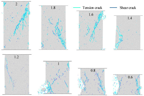 In order to observe more clearly the trends in mechanical parameters such as UCS with the HDR, the stress–strain curves are plotted in Figure 5. It can be seen that specimens with different HDRs display different trends. They did not increase or decrease monotonically. At a HDR range of 0.6~1, the UCS increases with an increasing HDR and the peak strain decreases accordingly, and from the degree of inclination of the elastic phase of the curve, it can be seen that the elastic model also increases. The same pattern is satisfied at a HDR of 1.2~1.6. However, at HDRs of 1.6~2, the mechanical parameters change in the opposite trend. The details are analyzed below. Those with HDRs less than 1 are affected by end effects and show X-shaped failure. Those with HDRs greater than or equal to 1.2 have obvious unilateral development of cracks. In order to obtain these results, a total of 45 samples, 5 for each of the nine specimens with HDRs ranging from 0.6 to 2, were tested. Taking 1.2 as the turning point, this is also reflected in the subsequent numerical simulation.
