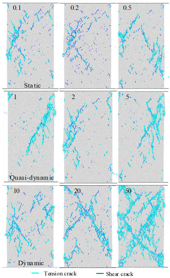 where and are the UCS value and peak axial strain when the SR in the static phase (0.1~0.5 mm·min−1), respectively; and are the UCS value and peak axial strain when the SR in the quasi-dynamic phase (1~5 mm·min−1), respectively; and are the UCS value and peak axial strain when the SR in the dynamic phase (10~50 mm·min−1), respectively; is the LR.