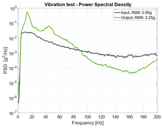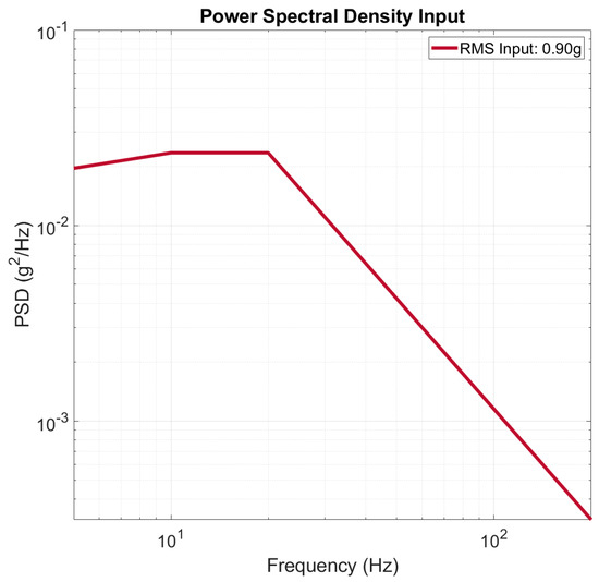 The system was excited in a vertical direction using a PSD profile with RMS acceleration of 0.9 g (Table 1). Figure 2 displays the graphical representation of the PSD input. The shape and measurement frequency range of the defined PSD input is based on automotive standard IEC 60068-2-64 Environmental testing—Part 2-64: Tests—Test Fh: Vibration, broadband random and guidance.