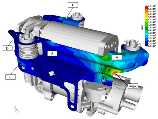 The von Mises stress results from the random vibration analysis using the equivalent effective acceleration method are presented in Figure 9. Points A-F serve as reference points for further comparison with the experimental data.