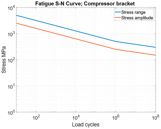 First, from the stress PSD function, the spectral moments , and were determined. Next, using the relations between the spectral moments, the statistical stress parameters were determined: the expected number of zero-crossings , the expected number of positive peaks , the irregularity factor , and the equivalent RMS stress value . The bracket material is specified as fine-grained steel suitable for cold-working. The S–N curve (Figure 11) was derived based on the fatigue limit = 185 MPa and the corresponding number of cycles = 106. The curve slope k is determined to be 5.