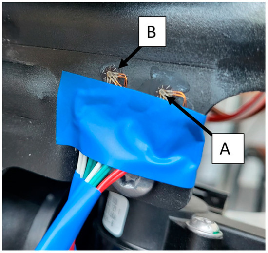 To verify the method, strain gauges were employed to control strains on the compressor bracket under random vibration test using PSD input from Table 1. Strain gauges were glued at the reference points A–F according to Figure 9. An example of the used strain gauges and measurement location is shown in Figure 12.