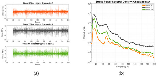 Similarly to the accelerations, the strain time history was recorded and converted into power spectral density. Based on that, the stress components were calculated, and example results for point A are presented in Figure 13. The PSD results clearly show that the stress response closely follows the acceleration pattern, with two distinct peaks observed.