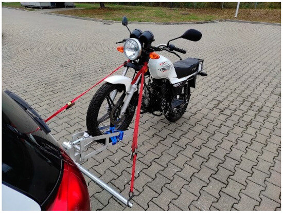 The second case study focuses on analysing a transportation system consisting of a motorcycle transport device, an automobile, and a motorcycle. This device is mounted on the car’s hitch, as shown in Figure 14. During transportation, it is subjected to random vibrations originating from the road surface over which the movement takes place. While the S–N curves (fatigue strength) of the materials used in the device’s construction are well-known, the exact loads and excitations acting on this device remain unknown.