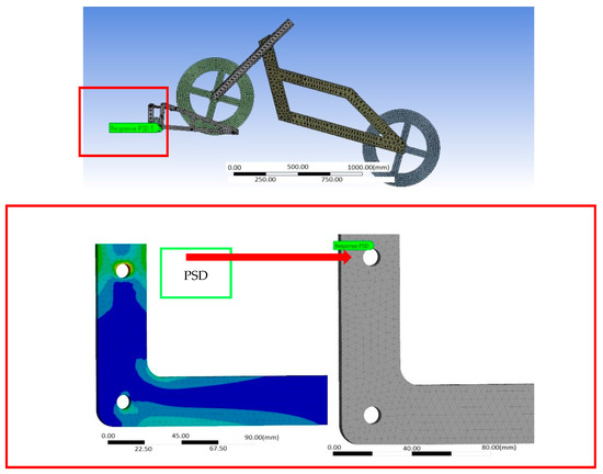 To conduct a more advanced analysis, Ansys Random Vibration tools were employed, enabling the modelling of interactions caused by random vibrations. These simulations were conducted while considering boundary conditions, which were selected in accordance with the research carried out in the publication by Mazurek and Mamala. The device’s mounting location was modelled as a fixed support, the rear car wheel as a cylindrical support, and the entire motorcycle system with a mass of 200 kg was appropriately considered. For the purpose of representing real-world conditions, an excitation in the form of PSD was applied to the fixed support point.