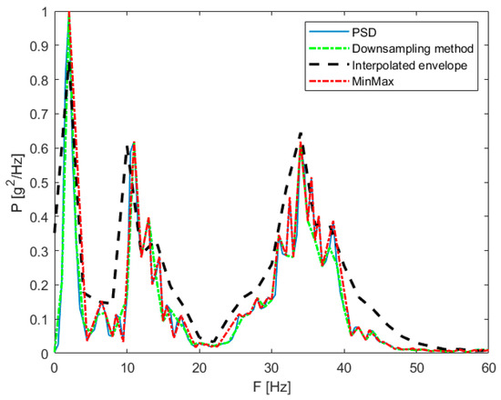 The Motorcycle Transport Device’s fatigue life was predicted using the PSD data obtained from real-world measurements. The PSD simplification methods, including normalization, reduction of characteristic points, and interpolated envelope, were applied to the PSD function. Figure 20 shows the comparison between the original PSD and the simplified PSDs.