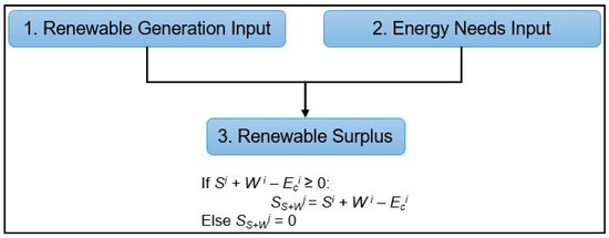Step I—Primary Renewable Energy Sources: Hourly data on solar (Si) or wind (Wi) energy production is obtained from the PVGIS database. If solar energy is the main source, it is checked if it can meet the energy demand. Any excess energy indicates a surplus.