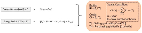 The cash flow (n) corresponds to the total annual difference between profits and costs, where “n” represents the year; profits(i) and costs(i) are the hourly profits and costs, respectively; and “k” is the total number of hours in the studied year.