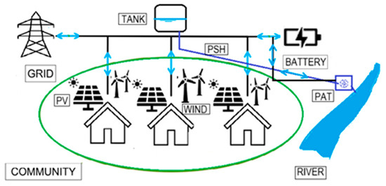As a model deployment, it was utilized to analyze a microgrid of a small energy community as a microgrid may be entirely isolated from the national electric grid (i.e., stand-alone) or grid-connected (Figure 7). In the latter case, synchronization is required to enable imports/exports between the microgrid and the outside grid network.