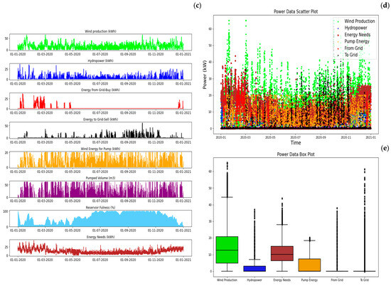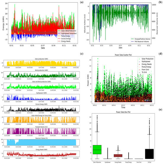 SA1—PV + Wind + PHS yearly balance: (a) energy balance, (b) water balance, (c) energy by sources, (d) power data, and (e) statistics (between percentile 25 and 75%).