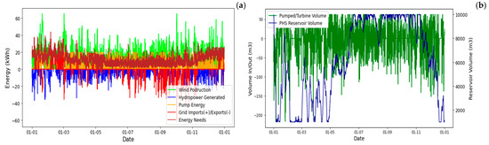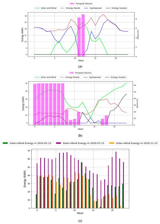 The high energy demand requires more hydropower generation to satisfy the unmet consumption by solar and wind energy sources. Subsequently, February is characterized by the balance presented, wherein the pumped volume is restricted to a few hours, defined in Figure 10a, permanently decreasing the reservoir’s stored volume, and hydropower is highly required to fulfill the energy needs. On the contrary, for months of lower demand, such as is presented in Figure 10b, the installed power of solar and wind is enough to completely fulfill the energy load, with its surplus being used to pump significant volumes of water for storage.