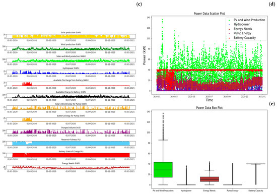 SA2—PV + Wind + PSH + BESS yearly balance: (a) energy balance, (b) water balance, (c) energy by sources, (d) power data, and (e) statistics (between percentile 25 and 75%).