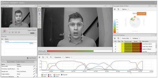 FaceReader screenshot recording the emotion “surprised”. Image retrieved from https://www.noldus.com/facereader/set-up, accessed on 11 September 2024.