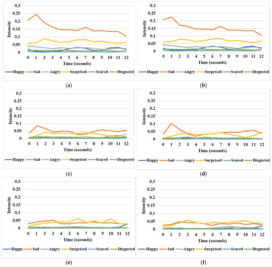 Data analysis involved three stages, following the methodology described by Wijk et al. [25]. Firstly, face detection proceeded to model facial expressions and concluded with classifying expressions using an artificial neural network. This classification process allowed the quantification of basic emotions, including happy, sad, angry, surprised, scary, and disgusted. The quantification of these emotions ranged between 0 (indicating no detection of the emotion) and 1 (representing maximum detection). FaceReader has been trained using intensity values annotated by human experts. A mixture of emotions often causes facial expressions; two (or more) expressions may coincide with high intensity. Therefore, the sum of the intensity values for the expressions at a particular time point usually does not equal 1.