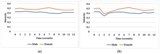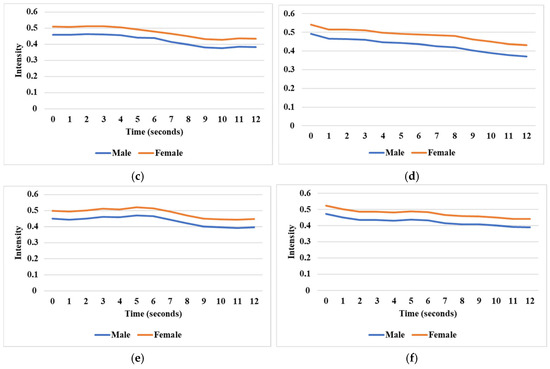 The analysis of arousal levels using FaceReader (Figure 3) reveals a consistent pattern across all wine samples, where females exhibited higher arousal than males. This heightened arousal among female participants suggests a more robust emotional response to the tasting experience. The difference in arousal levels could be attributed to several factors, including potential variations in sensitivity to taste or emotional expressiveness between genders. Females may be more attuned to subtle flavor nuances, leading to a more pronounced emotional reaction [37,38], or they might naturally express their emotional states more intensely through facial expressions [39,40]. This consistent trend across all wine varieties emphasizes the need to consider gender differences when interpreting emotional responses in sensory evaluations.