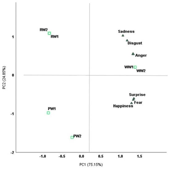 An Excel (Microsoft) file containing the quantified emotions was generated. Then, the data were exported to SPSS (IBM SPSS Statistics 29) to perform a PCA to illustrate the emotional experiences reported by participants.