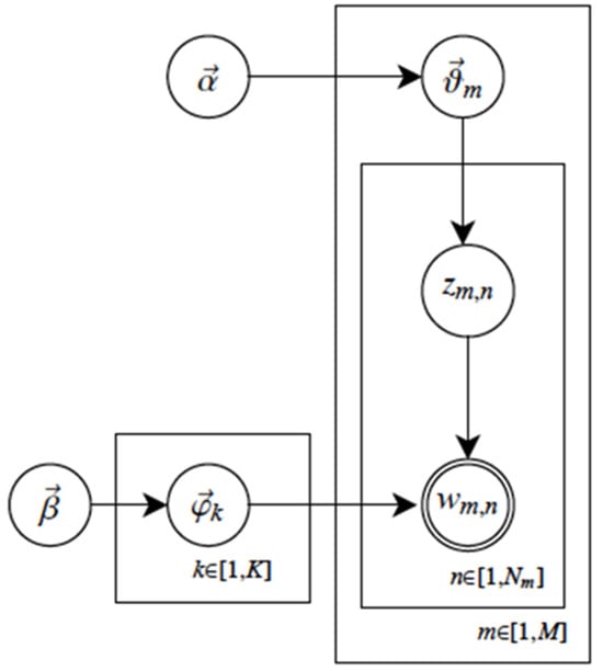 In the LDA model, the generation process of a document’s “document-word” structure is depicted in Figure 1. First, the topic distribution of the document is selected from a Dirichlet distribution with hyperparameter α, meaning that the topic distribution is generated from a Dirichlet distribution parameterized by α. Next, a topic for the -th word in the document is sampled from . Then, a multinomial word distribution corresponding to the topic is sampled from a Dirichlet distribution with parameter , Finally, the word is sampled from This process is repeated n times to generate the “document-term” structure for a document.