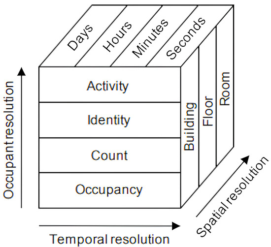The occupancy resolution level varies depending on the application. For example, sometimes it is enough to determine the occupancy of a particular zone, whether complicated energy-saving systems may require both the number of occupants in different zones, and the fluctuations in occupancy intensity throughout the day []. As proposed by Melfi et al. [], the occupancy resolution can be measured in three dimensions: spatial resolution, temporal resolution, and occupancy resolution (Figure 3).