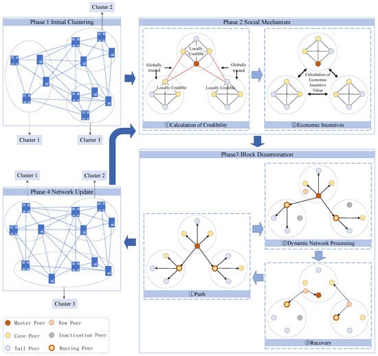 In recent years, significant advancements have been made in the field of broadcasting. Hao et al. [15] developed the BlockP2P propagation structure, which uses the K-Means algorithm for peer clustering and a parallel spanning tree broadcasting algorithm for rapid data dissemination across clusters. Subsequently, they introduced a method to efficiently detect peer failures and reduce network load [16]. However, this study is limited by its exclusive focus on public blockchain environments, overlooking potential issues in consortium and private blockchains. Furthermore, the absence of a comparative analysis of clustering algorithms impedes the evaluation of their performance and applicability. Berendea et al. [17] concentrated on Hyperledger Fabric, proposing the infect-upon-contagion algorithm to replace the Gossip protocol’s push mechanism. They optimized the remaining propagation mechanism, enhancing both efficiency and fairness in the Fabric broadcast layer. However, this study focuses solely on block propagation coverage and reliability, omitting an analysis of peer security. Additionally, the discussion on network topology construction lacks detail. To further improve the security of blockchain networks, some studies have introduced peer review mechanisms into blockchain systems. In distributed networks, peer review mechanisms are used to assess node reliability, with nodes reviewing each other’s transactions to ensure that data are validated by multiple nodes before or after being added to the blockchain. This mechanism helps prevent the dissemination of false information by malicious nodes and guarantees the accuracy and integrity of broadcasted data. Oktian et al. [18] designed a peer review model to construct a mature blockchain-based federated learning protocol, incentivizing participating nodes to act honestly and optimize their training efforts for higher rewards, while also punishing malicious behavior. This approach enhanced data privacy and system reliability. However, the study’s primary application scenario was limited to federated learning, failing to adequately address block propagation efficiency issues within blockchain systems. Furthermore, the protocol’s punishment mechanism for malicious nodes is relatively simplistic and fails to fully leverage the network topology to optimize data dissemination paths. Yang et al. [19] integrated a reputation mechanism into the blockchain data-sharing process, allowing users to receive reputation feedback based on their partners’ behavior, allowing honest users to benefit from more data-sharing opportunities, while malicious users are held accountable and removed from the system. However, the reputation feedback mechanism mainly relies on cooperative relationships between users, overlooking the effects of node changes in dynamic networks on propagation efficiency. These two studies have made valuable contributions to improving system security, but further advancements are needed in optimizing network topology and dynamic trust mechanisms. In addition, recent advances in blockchain verification and model checking have significantly enhanced the security and reliability of blockchain systems. Among these advancements, two notable studies by AlSobeh introduced innovative frameworks that enhance the verification of dynamic behaviors in blockchain systems. For example, the BlockASP [20] framework employs aspect-oriented programming (AOP) to analyze and monitor dynamic behaviors within blockchain systems, integrating the strengths of aspect-oriented programming and model checking into the blockchain architecture to ensure the security of decentralized networks. Similarly, the OSM [21] framework extends model-checking techniques to analyze and verify dynamic behaviors in software systems, and this approach can also be applied to blockchain systems to ensure the secure and dynamic operation of blockchain protocols. Both frameworks provide valuable insights into the evolving field of blockchain consensus algorithms, particularly in enhancing the security and dynamic verification of blockchain networks. However, these frameworks are limited to runtime verification in software environments and do not explicitly address the challenges of maintaining efficient communication and scalability in decentralized, large-scale blockchain environments.