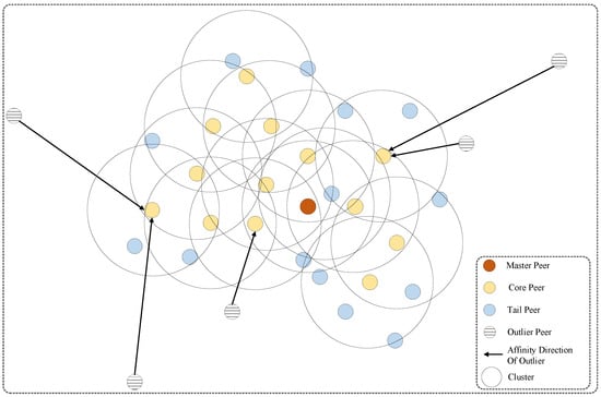 However, the recursive nature of DBSCAN necessitates multiple iterations, leading to a worst-case time complexity of . Consequently, in large blockchain networks, DBSCAN incurs significant computational costs in creating the propagation structure, rendering any reduction in propagation latency insignificant. To address the aforementioned issue, we introduced DBSCAN++ within the framework of DC-SoC [28]. In the original DBSCAN algorithm, core objects are identified by traversing the entire peer set. However, this approach often results in a high sampling rate, unnecessary as the identification of cluster classes and construction of propagation structures typically do not require many core objects. Therefore, DBSCAN++ approximates the K-center algorithm through the use of a greedy initialization method. In this method, the peer with the highest latency from the current input peer is consistently selected during the core peer search and added to the set S until the number of peers in S meets the specified parameter m. The value of the parameter m is determined based on specific circumstances. Subsequently, peers in the set S are traversed to identify the core peer and its neighborhood, ensuring the computation process for high overhead density stays within m iterations. Lastly, the remaining outliers are incorporated into the neighborhood of the nearest core object via a KD tree. In conclusion, DBSCAN++ leverages the idea of K-center to reduce the sampling rate of core objects while maintaining effective neighborhood coverage in the space. Its time complexity is , where n represents the total number of peers. Figure 2 illustrates the schematic diagram of the peer clustering process in DC-SoC.