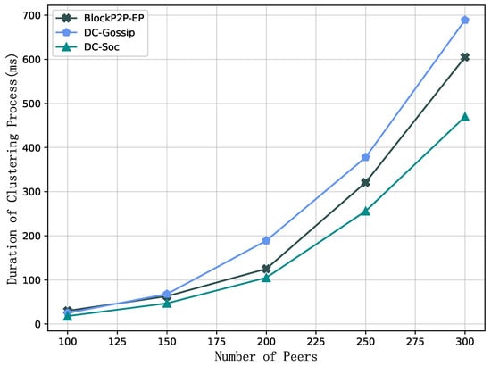 From Figure 4, it is evident that the BlockP2P-EP data propagation model, derived from the DBSCAN clustering algorithm, and DC-Gossip, based on the OPTICS clustering algorithm, demonstrates greater clustering complexity. Furthermore, as the network size expands, the clustering time increases at an accelerated rate. In contrast, DC-SoC-DB substantially reduces clustering time within the DC-SoC model by employing a lower sampling rate for core objects. When the number of nodes reaches 300, its time consumption is only 68.2% of that of OPTICS, another density-based clustering algorithm. It is important to note that these experiments are conducted on a dynamic network to simulate real-world network scale-up scenarios. The experiments involve increasing both the number of Peers and the latency range between Peers. Specifically, the interval between each new peer joining ranges from 8 to 15 ms, the interval between inactivated peers appearances ranges from 10 to 20 ms, and the interval between re-connections of inactivated peers ranges from 15 to 25 ms. Please refer to Table 3 for additional parameter settings.