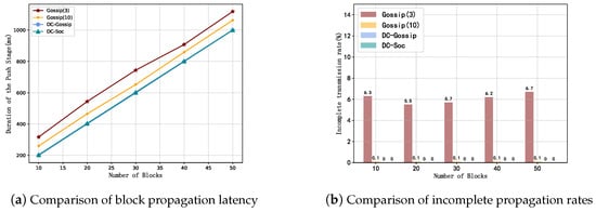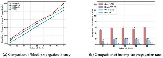 The results of the malicious behavior resistance test for the first set of experiments are depicted in Figure 8. Discerning the presence of malicious peers is challenging during the initial network startup phase due to the absence of transactions between peers. Consequently, the social mechanism requires a certain timeframe for the transaction data collection phase to become gradually effective. Based on the aforementioned premise, this experiment considers the initial 10 blocks of transaction propagation as the transaction data collection phase. Subsequently, upon the conclusion of the collection phase, the social value is formally employed to activate malicious blocking. Consequently, in Figure 8a, the number of distorted transactions in the network is identical when the social mechanism is activated and when it is not activated, at 10 blocks. Subsequently, it becomes evident that the activation of the social mechanism exerts a substantial defensive and preemptive effect against malicious behavior. In the absence of the enabled social mechanism, the number of distorted transactions attained by malicious peers in the network will rapidly escalate, thereby severely impeding the normal network operation. Enabling the social mechanism in DC-SoC reduces the number of distorted transactions in the network to approximately 21% of the original count after 50 blocks of propagation. Conversely, within the same network structure, the number of missed distorted transactions under the malicious peer detection mechanism employed in BlockP2P-EP is up to three times greater than that of DC-SoC. Additionally, as depicted in Figure 8b, DC-SoC consistently maintains the incomplete propagation rate at approximately 3% when confronted with malicious attacks. Conversely, the incomplete propagation rate of BlockP2P-EP exhibits an upward trend with the transactions, occasionally exceeding 10%. This discrepancy arises due to BlockP2P-EP’s deficiency in effective measures to counter conspiracy attacks, leading to erroneous identification of certain normal peers as malicious ones and subsequent interception and failure of numerous secure transactions.