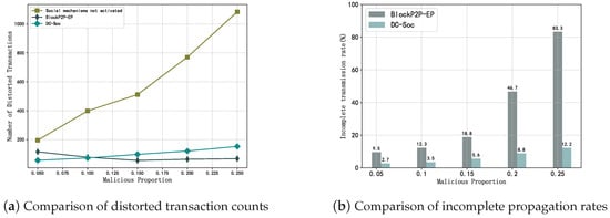 However, the assessment of data propagation reliability in a network cannot solely rely on the incomplete propagation rate. Given that the blockchain consists of numerous genuine user peers, the presence of malicious attackers in real-world applications is highly probable. To validate the robustness of the DC-SoC model against sophisticated attacks such as Sybil and Byzantine behavior, we conducted a series of experiments simulating environments with varying proportions of malicious nodes. A distortion transaction refers to a scenario where a peer accepts a false message from a malicious peer. Subsequently, upon successful propagation of the distorted message, the malicious peers collaborate to exploit the inconsistency in the ledger content and block sequence, thereby compromising the system’s security. To enhance the complexity of the broadcasting environment and obtain objective test results, this set of experiments involves 300 peers in a dynamic network, utilizing the DC-SoC-DB clustering algorithm. Regarding the determination of the number of malicious peers, this paper adopts the experimental setup of malicious user detection researcher Yu et al. [30], wherein 1 malicious user is set for every 20 users. These malicious peers disseminate distorted information within the network at a specific frequency.