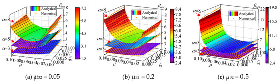 The optimal frequency ratio βopt obtained by the proposed Formula (30) (denoted by Analytical) and by the numerical optimization technique (denoted by Numerical) under the combination of various mass ratio μ, lever mass ratio μ32 (0.05, 0.2 and 0.5), damping ratio ζ1 and length ratio α (3, 5 and 8).