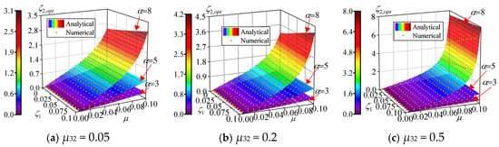 The optimal damping ratio ζ2,opt obtained by the proposed Formula (30) (denoted by Analytical) and by the numerical optimization technique (denoted by Numerical) under the combination of various mass ratio μ, lever mass ratio μ32 (0.05, 0.2 and 0.5), damping ratio ζ1 and length ratio α (3, 5 and 8).