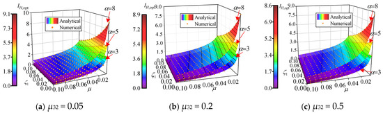 The optimal performance indices IH,opt obtained by the proposed Formula (29) (denoted by Analytical) and by the numerical optimization technique (denoted by Numerical) under the combination of various mass ratio μ, lever mass ratio μ32 (0.05, 0.2 and 0.5), damping ratio ζ1 and length ratio α (3, 5 and 8).