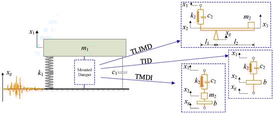 The ground motion-excited (by the white noise and the earthquake excitation, respectively) TLIMD-structure responses are evaluated in the current section. Here, a uniform length ratio is also assumed to be α1 = α2 = α (i.e., l2 = l3) given the practical consideration. Previous studies indicate that the lever can be treated as an ideal inerter element under a certain structural configuration [22]. Thus, for comparison, two of the most classic inerter-based dampers (shown in Figure 6), i.e., the tuned inerter damper (TID) and the tuned mass damper inerter (TMDI), are included in the current discussion. b denotes the inertance of the inerter (i.e., the apparent mass). A detailed definition of b can be found in the cited references [1,2,3]. The inertance ratio is defined as μb = b/m1. The lever mass is ignored in the following discussion μ32 = 0 given its minor influence in a practical application. For a fair comparison, the effective mass of these three dampers are unified, i.e., .