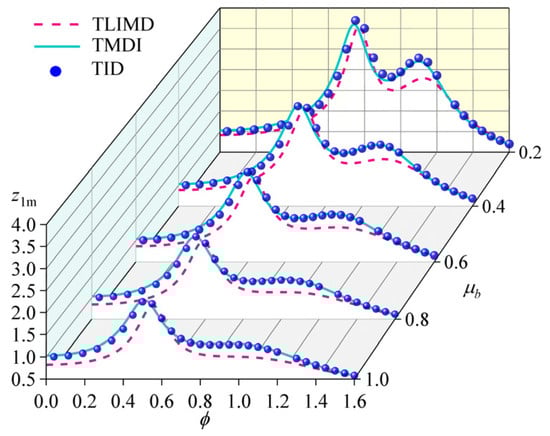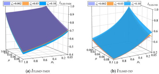 Figure 7 shows the variation tendency of the two performance indices (given in (31)) with various critical parameters. The concentrated mass m2 used in TLIMD and TMDI are set to the same, with its value varying from 0.005 to 0.1, i.e., μ = 0.005~0.1. The inertance ratio μb of TMID and TID are identical, taken as μb = 0.05~1.0, and the length ratio can be determined from the equilibrium . The optimal parameters for the TLIMD are determined by (30), while the TMDI and TID are optimized by numerical technique. As seen, both indices are below 1 under the selected configuration cases, which exhibits the superiority of the TLIMD. As expected, the increases in mass ratio μ and inertance ratio μb are always beneficial to the TLIMD control performance. The enhancement of the structural mass ratio ζ1 leads to a decrease of ITLIMD-TMDI, while inducing an increase in ITLIMD-TID. Nevertheless, the TLIMD still shows big advantages over those conventional devices, even under the larger structural damping scenario (such as ζ1 = 10%).