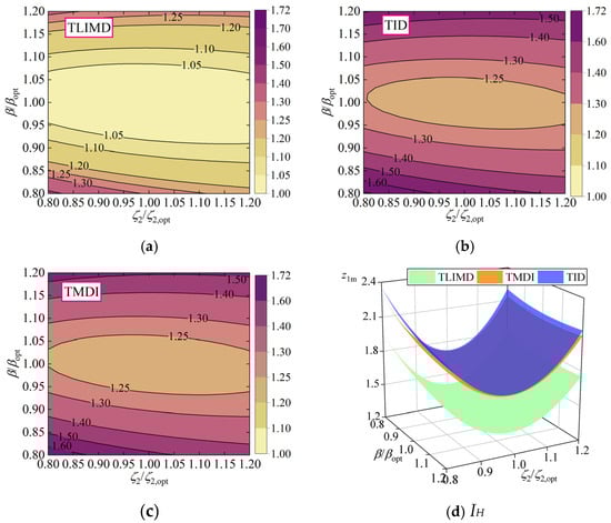 Figure 10 shows the maximum amplitude ratios of primary structure with various frequency and damping ratios deviated from the damper optimal design values. The mass ratio μ for the TLIMD and TMDI is set to 0.01, and the inertance ratio for the TMDI and TID is set to 0.1. It can be seen that the contour lines for the TMDI and TID looks the same while the sensitive performance of the TLIMD may be better than the others due to its small value. Figure 10d further ensures this conclusion, in which the TLIMD provides the minimal indices IH value.