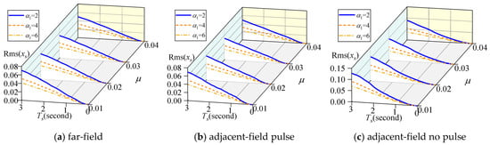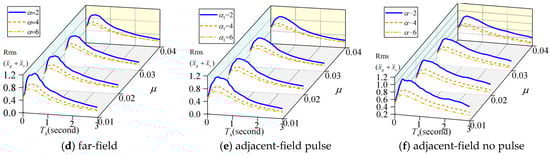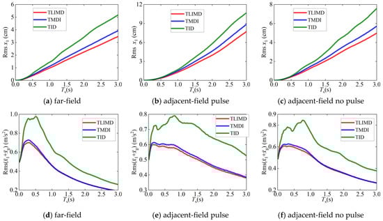 According to the guideline of FEMA P-695 [46], 44 far-field, 28 near-field pulse and 28 no-pulse ground motion records are investigated here, and the peak acceleration is all set to 0.3 g. Statistical results of the structure responses are given in Figure 11 and Figure 12. Figure 11 shows the root mean square (RMS) of the structure relative displacement x1 and absolute acceleration responses . As seen, the structural responses can be effectively attenuated by increasing the length ratio and the mass ratio under all types of ground motion excitation. A comparison case for these three dampers is given in Figure 12, where the length ratio and the mass ratio are set to = 0.02 and = 3. As seen, the TLIMD consistently provides the minimal values.