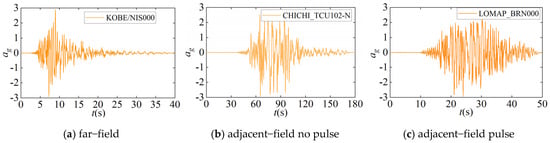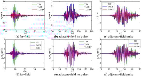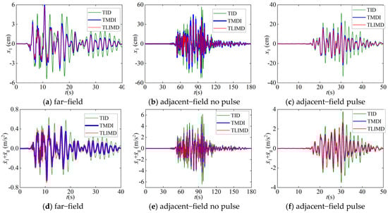 Here, three typical ground motions, given in Figure 13, is selected in the following discussion, and two types of structures (i.e., the long and short period structures, Ts = 0.5 and 2 s) are considered. For both the short (given in Figure 14) and long period (given in Figure 15) structures, the TLIMD exhibits a noticeably better control performance than the TID. However, for the long period structure under the adjacent-field pulse ground motion, the TLIMD is not significantly better than the TMDI, as demonstrated in Figure 15c,f.