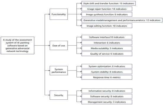 The purpose of this paper is to construct an evaluation system for AI painting software based on generative adversarial network (GAN) technology, which optimizes the performance of the related software in terms of functionality, ease of use, system performance, and safety. The results of the questionnaires are statistically analyzed. In addition, an exploratory factor analysis was conducted to extract the data of the study, which were ultimately used to calculate the weight and importance of each index using the fuzzy hierarchical analysis method. This study constructed an evaluation system for AI painting software based on GAN technology, including 16 indicators of functionality, 16 indicators of ease of use, 7 indicators of system performance, and 8 indicators of safety, respectively, whose alpha coefficients were 0.882, 0.962, 0.932, 0.932, and 0.932, respectively. In addition, the accumulated explanatory variances of their coefficients were 84.405%, 84.897%, 84.013%, 72.606%, 73.013%, and 72.606%, respectively. It is clear that the items included in each of the indicators are homogeneous, with a high degree of internal consistency. This paper suggests that the development of AI painting software focusing on functionality, ease of use, system performance, and safety can enhance the market competitiveness of the software.