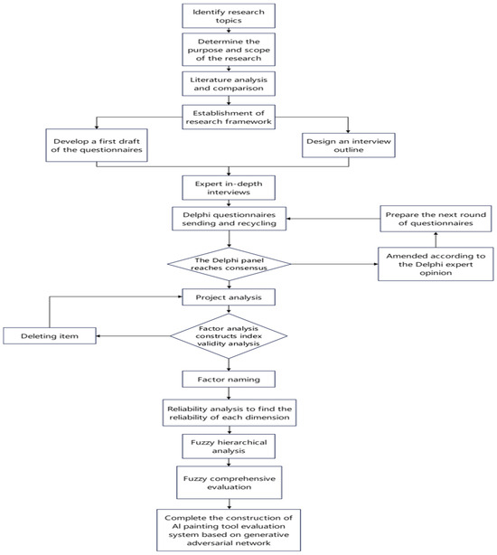 The implementation procedure for the establishment of the indicators in this study is shown in Figure 2, which is summarized below. Through the literature collection and in-depth interviews with three experts, the results of the interviews were organized and analyzed. The information from the questionnaire was extracted and modified according to the suggestions of the supervising professors in order to fulfill the first round of the Delphi questionnaire. The Delphi Expert Panel consisted of eight experts, including three executives from domestic AI technology companies and five full-time faculty members from computer science departments of undergraduate colleges and universities, who revised the Delphi questionnaire two times before distributing the first round of Delphi questionnaires. In response to the need for environmental protection and saving energy, the researcher used an email for the electronic questionnaire which was sent to each expert. Delphi questionnaires for Round 1 were mailed on August 31st, with collections performed on September 23rd. Round 2 Delphi questionnaires were mailed on October 1st to be collected on October 31st. There are 123 indicators in 4 dimensions of AI painting software based on GAN, including 57 indicators in functional dimension, 27 indicators in the ease of use dimension, 20 indicators in the system performance dimension, and 19 indicators in the safety dimension.
