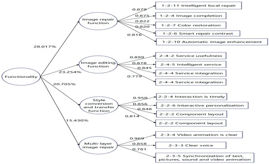 The results of the factor analysis are shown in Figure 3 and Figure 4. The weights of functionality, ease of use, system performance, and security are 0.3, 0.25, 0.2, and 0.24, respectively, which shows that functionality has a stronger influence. The weights of multi-layer image restoration, style transfer and migration, image editing, and image restoration are 0.19, 0.22, 0.29, and 0.3, respectively, which shows that image restoration is more powerful than the other three indicators. Media applicability, service quality, image editing, and image restoration are more important than the other three indicators. The weights of media applicability, service quality, interaction, visual harmony, and pattern recognition are 0.18, 0.2, 0.19, 0.26, and 0.17, respectively, which shows that the weights of the five indicators are not significant.