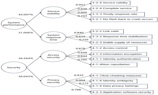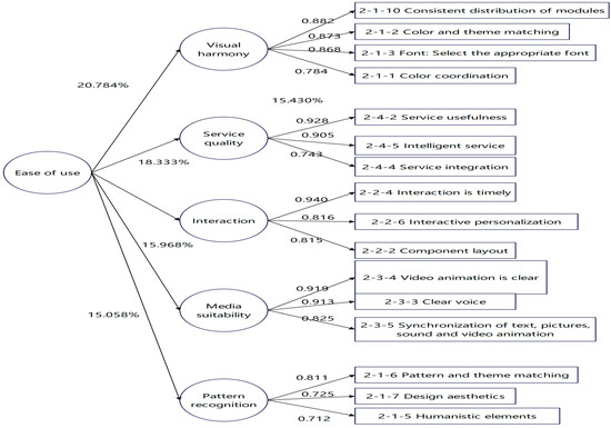 The results of the factor analysis are shown in Figure 3 and Figure 4. The explained variances of image restoration function, image editing function, style transfer and migration function, and multi-layer image restoration function are 28.017%, 23.254%, 20.705%, and 15.430%, respectively, which shows that the explained variances in the image restoration function are higher than those of the other three indexes; the explained variances of visual harmony, quality of service, interaction, media applicability, and pattern recognition are 20.784%, 18.333%, 15.968%, 15.058%, and 14.755%, respectively. Visual harmony, service quality, interaction, media suitability, and pattern recognition are 20.784%, 18.333%, 15.968%, 15.058%, and 14.755%, respectively, which shows that the explained variance in visual harmony is higher than that of the other four indicators; the explained variances in service stability and system response time are 42.007% and 31.006%, respectively, which shows that the explained variance in service stability is higher than that of system response time; the explained variances in access security and privacy security are 36.564% and 36.043%, respectively, which shows that the differences between the explained variances of access security and privacy security are not obvious. Therefore, the scales have good construct validity, and the importance of image restoration function in “functionality” is greater than that of the remaining three indicators; the importance of visual harmony in “ease of use” is greater than that of the remaining four indicators; the importance of service stability in “system performance” is greater than that of system response time; and in the area of “security”, the importance of access security and privacy security is similar. Overall, the Cronbach’s alpha coefficients of all the dimensions in this study are higher than 0.80, while those of the whole scale are as high as 0.952. The cumulative variance is significantly higher, which indicates that the indicators included in each factor in the factor analysis have homogeneity and that there is a high degree of internal consistency among the indicators.