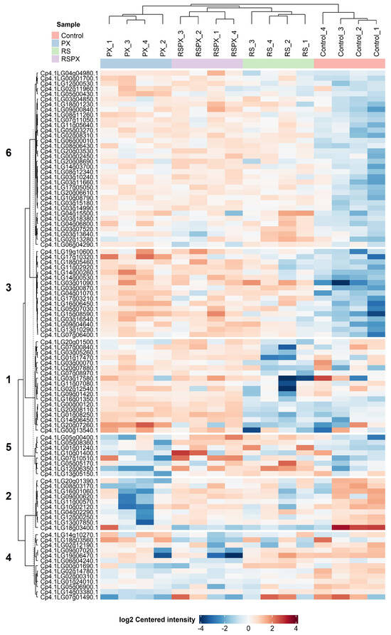 In PX- and RS-treated samples, several defense-related proteins were among the significant DEPs, albeit with relatively low expression levels. These included a pathogenesis-related thaumatin-like protein (Cp4.1LG20g08560.1), a pathogenesis-related protein PR-4 (Cp4.1LG11g09910.1), and two leucine-rich repeat (LRR) family proteins (Cp4.1LG15g04840.1; Cp4.1LG01g02450.1). These proteins have been reported to play crucial roles in plant responses to pathogens [107,108]. Although their roles are essential, the relatively low-fold changes in expression observed in different comparisons may be due to spatiotemporal influences, which will be discussed further.