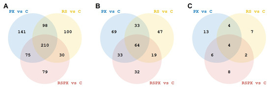Venn diagrams showing the overlap and differences of DEPs with p-values < 0.05 shared between the three comparisons of treated (PX, RS, RSPX) samples versus the Control. Treatment names are as described in Table 1. Overlaps for expression magnitudes above 1-fold (A), 2-fold (B), and 4-fold (C) difference in expression are shown.