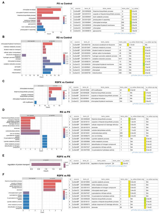 Gene Ontology terms (GO-terms) functional enrichment analysis of DEPs for all six comparisons (A–F) between the four treatment sample groups. Treatment names are as described in Table 1. GO-terms are presented as bar-plots on the left side of the figure, and using g:Profiler-type table outputs on the right side of the figure, respectively. The bar-plot panels on the left present quantitative data (counts) regarding up- and down-regulated DEPs, categorized from top to bottom according to significance (smaller to higher adjusted p-values), and irrespective classification of DEPs in main functional categories. The table panels on the right present the same GO-terms further categorized into three functional groups: biological process (BP), cellular component (CC), and molecular function (MF). GO-term IDs and sizes are also presented along with p-value significance scores.