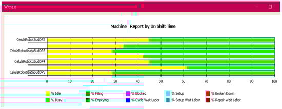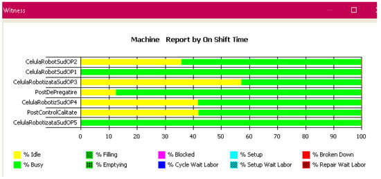 The virtual model was calibrated, comparing simulation output with actual production data to ensure the model accurately reflects real-world operations. In order to obtain improvements in production capacity and operational efficiency, the model was used to diagnose the performance indicator levels and identify the necessary changes. The focus was on identifying and validating the best parameters and the configuration of the manufacturing architecture. After using the virtual prototype to simulate the initial logistic flow, reports were generated, and the results obtained for each workstation were interpreted to identify the flow concentrators. The necessary changes to workstations were described, and the system architecture was modified accordingly. After these changes were implemented, detailed simulation results and optimization outputs (e.g., a 52% increase in production capacity, from 2618 to 3980 rear axles per week) were highlighted, demonstrating the significant impact of the optimization.