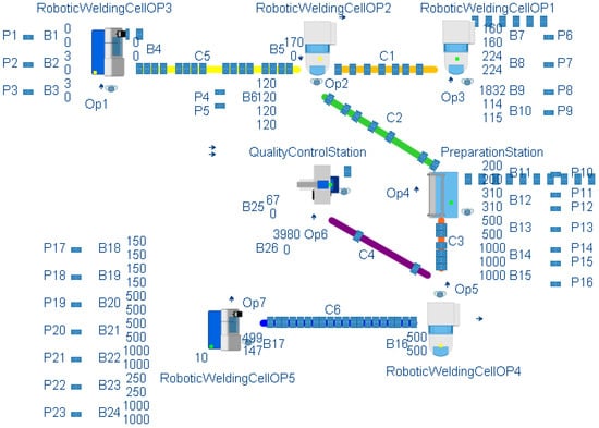The proposed virtual model shows significant improvements in both efficiency and flexibility; however, it has limitations, especially regarding scalability. These limitations must be addressed for further development of the model. As a result, future research will focus on conducting sensitivity analyses to evaluate how these optimizations perform under different conditions, thereby enhancing the system’s adaptability to changing production demands. It will also track energy usage across robotic cells and conveyors to improve efficiency. Additionally, implementing real-world pilot studies will be crucial to validate the theoretical benefits and tackle any unforeseen operational challenges.