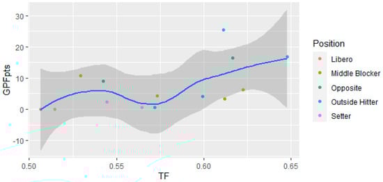 After determining the differences in jumping parameters and players’ positions, the correlation between jumping parameters (Table 8) and volleyball coefficients was checked in turn. Pearson’s correlation was used for this purpose. Peace [step/s], Tstance [cm], WalkingPoint X [cm], WalkingPoint GapX [cm], and StepWidth [cm] show no significant correlations with the volleyball coefficients. Flight time (TF) shows significance in GPF Points (Figure 1) and EF Attack. The height of jumps confirms this relationship, which also occurs in these two indicators. Lower limb power shows dependence in such indicators as GPF Reception, EF Service and EF Reception, which suggests the dependence between the effectiveness of reception and the power of lower limbs.