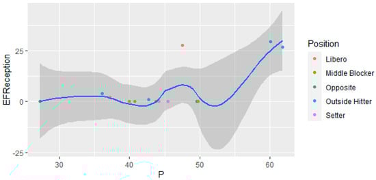 The lack of GPFReception and EFReception values for opposite players (Table 2) is related to the specificity of their position, in which they do not receive the serves. The minimum value of the EFSets coefficient for outside hitter players was 0.00, which indicates a mistake in this element or a lack of situational passes by at least one of the players appearing in this position. A similar situation occurs for players in the middle blocker position for the EFReception coefficient.