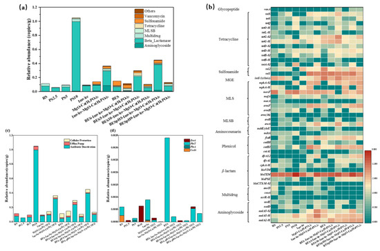 As shown in Figure 3a, seven categories of ARGs were identified in the soil before and after applying various remediation methods: aminoglycoside, β-lactam, macrolide-lincosamide-streptogramin B (MLSB), multidrug, sulfonamide, tetracycline, and vancomycin. ARGs abundance initially decreased, followed by a significant increase as Pb concentration rose. The highest total ARGs abundance was observed in soil with a Pb concentration of 10 g/kg (PS10).