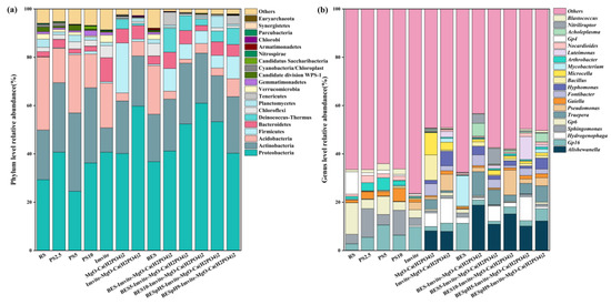 Microbial community distribution at the phylum level (a) and genus (b) level after different remediation methods.